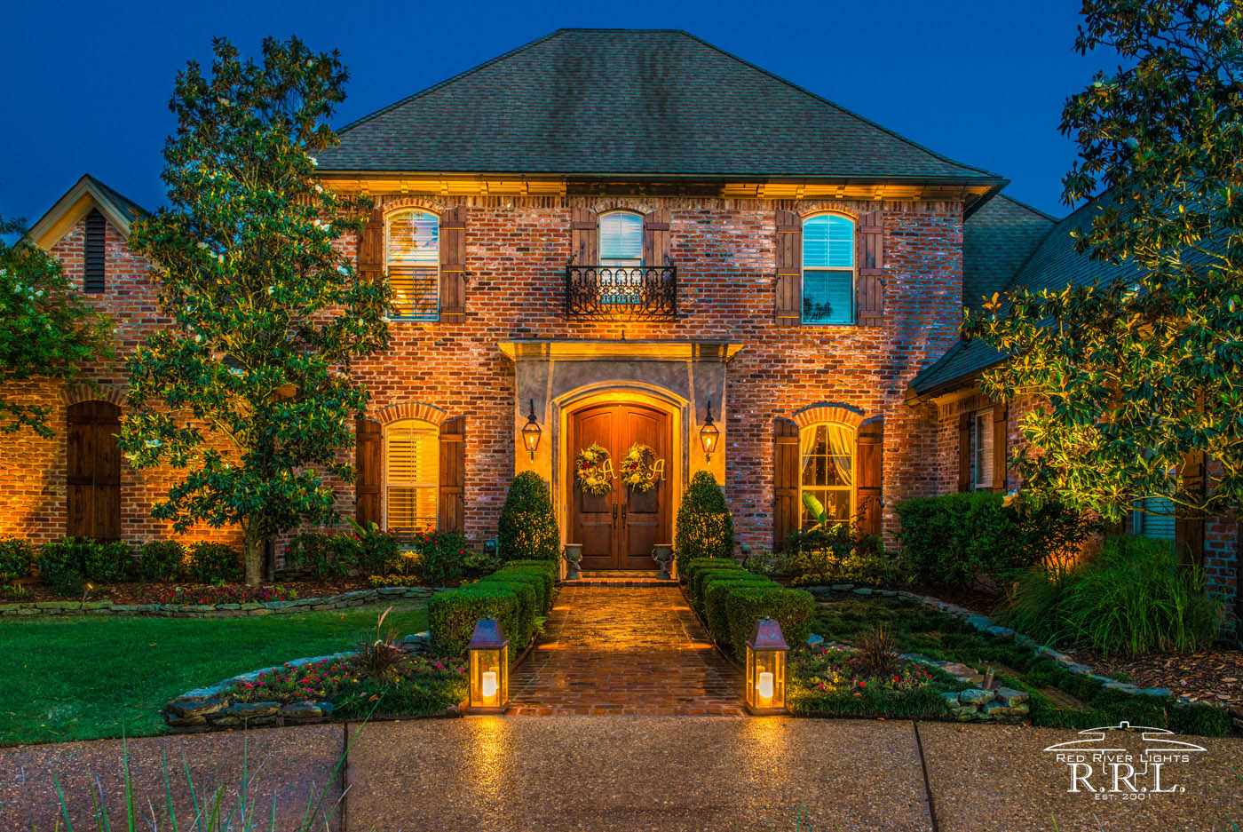 We collaborated with Copper Works Lighting to create these stunning copper lanterns installed for the walking areas. One of our ideas was to balance our typical up-accent lighting on the house and trees with ground-level custom-made lanterns from our friends at Copper Works. These lanterns themselves act as a visible focal point. In doing so, we were simultaneously able to emphasize the beautiful brick of the house, the Crepe Myrtle trees, and the architectural features of the home and landscaping, while also increasing security and safety.