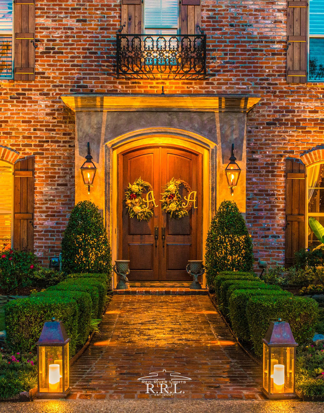 In addition to the lanterns, we also installed micro path lights along the front entrance walkway to help safely guide guests coming and going. Placing lights on either side of the path elegantly illuminates the brickwork and detailing.