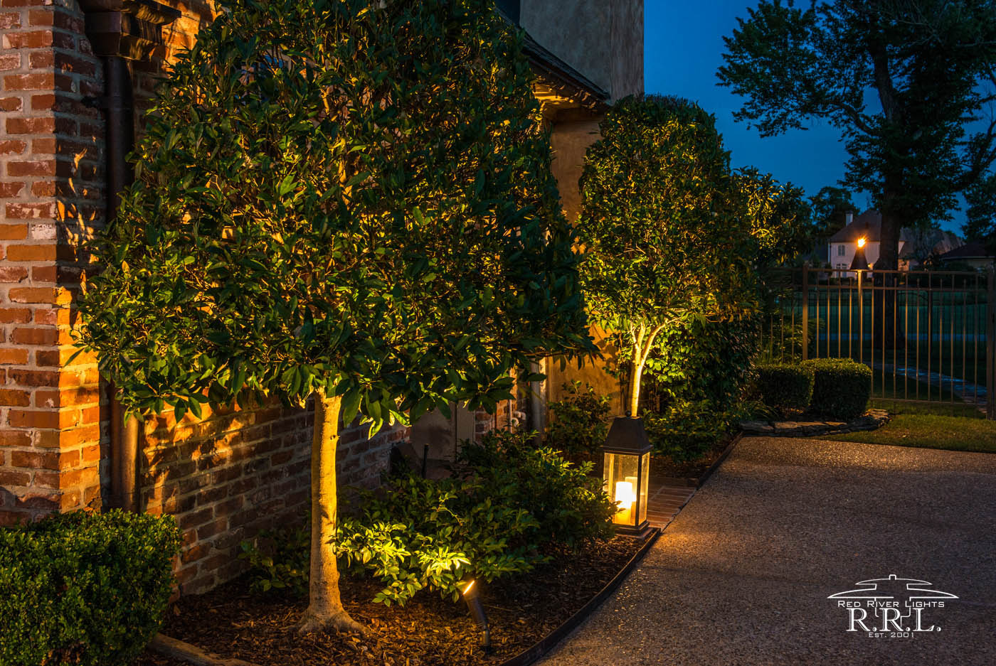 Further toward the back of the property, lining the side of the house with more up-accent lighting on the trees, and utilizing another lantern, we effectively increased residential security while maintaining design priority.