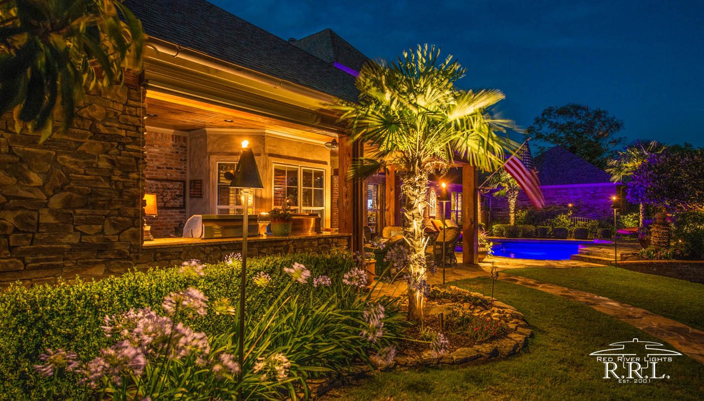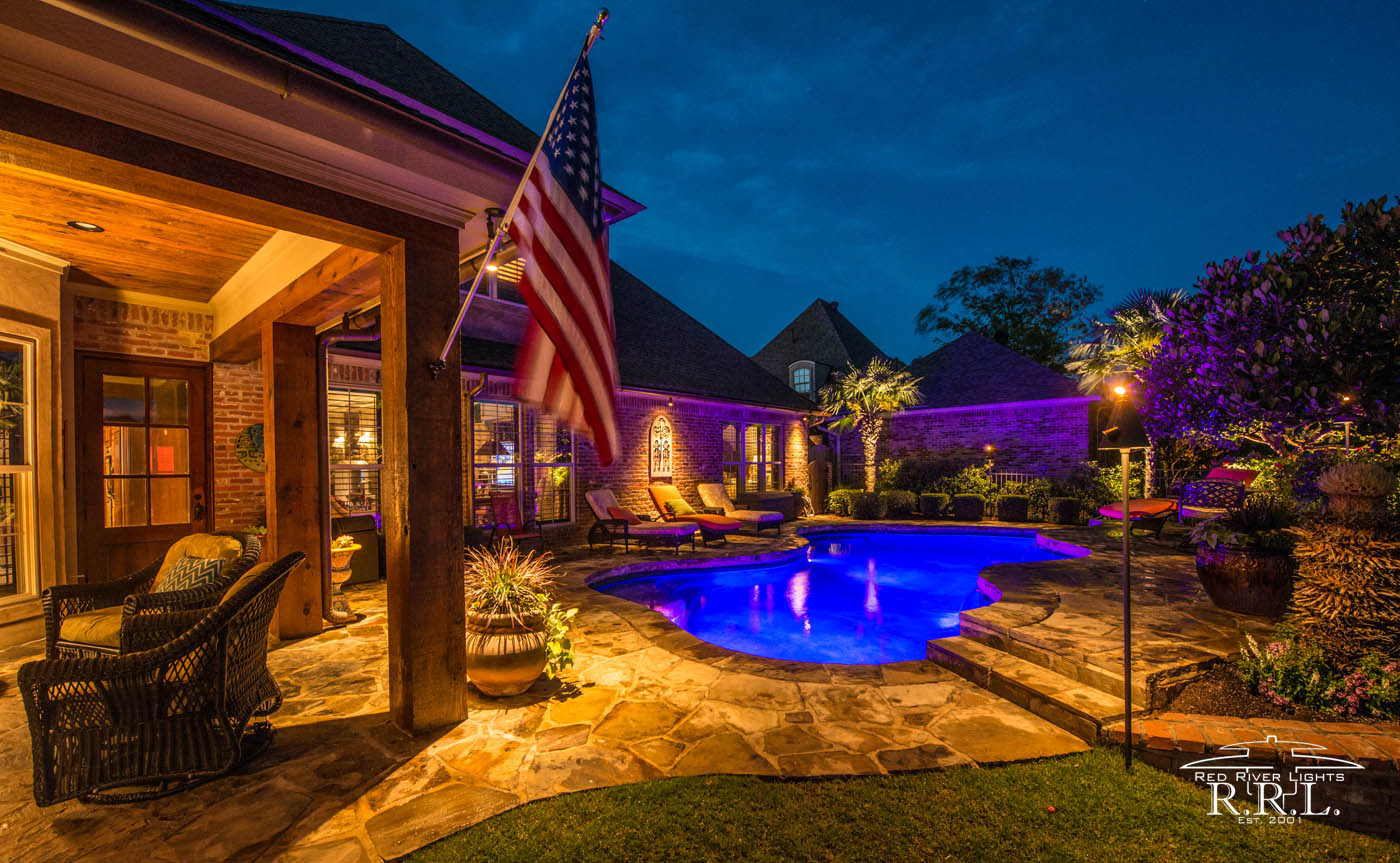 Driving through this Bossier subdivision, you'd probably be surprised to find this stylishly lit home. For this project, that we were fortunate enough to illuminate, the lighting design elegantly enhances the architectural features while also providing nighttime security and safety.